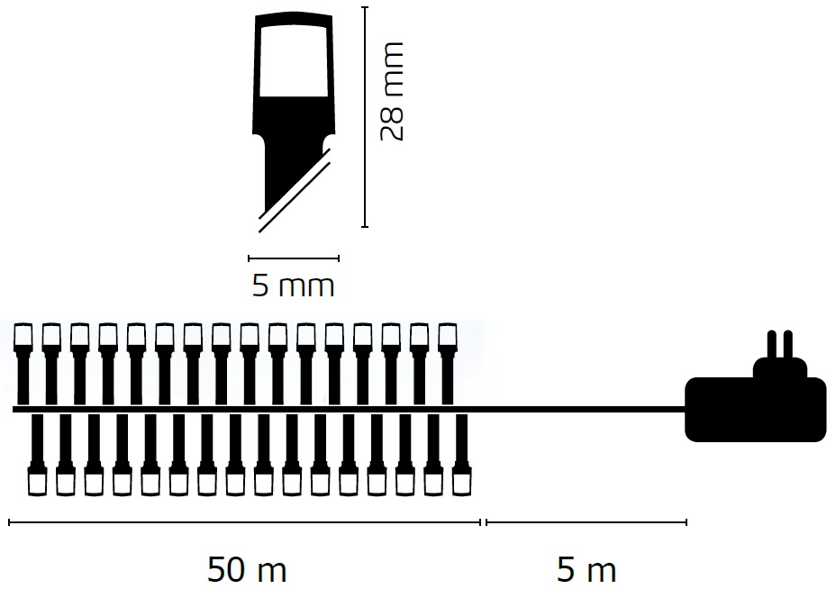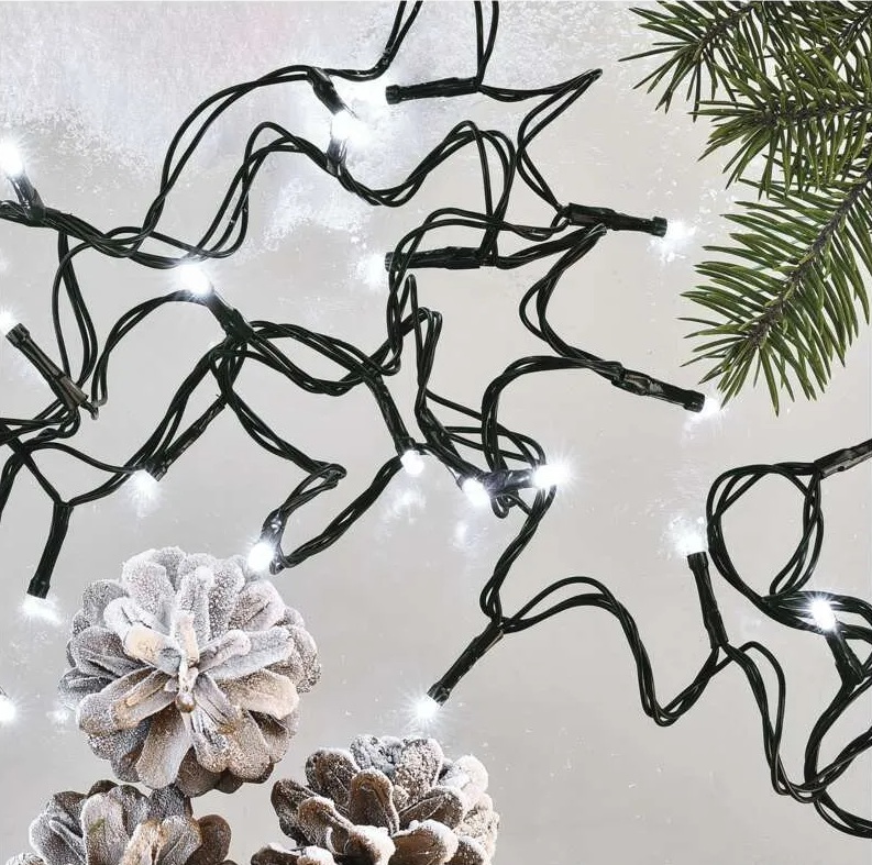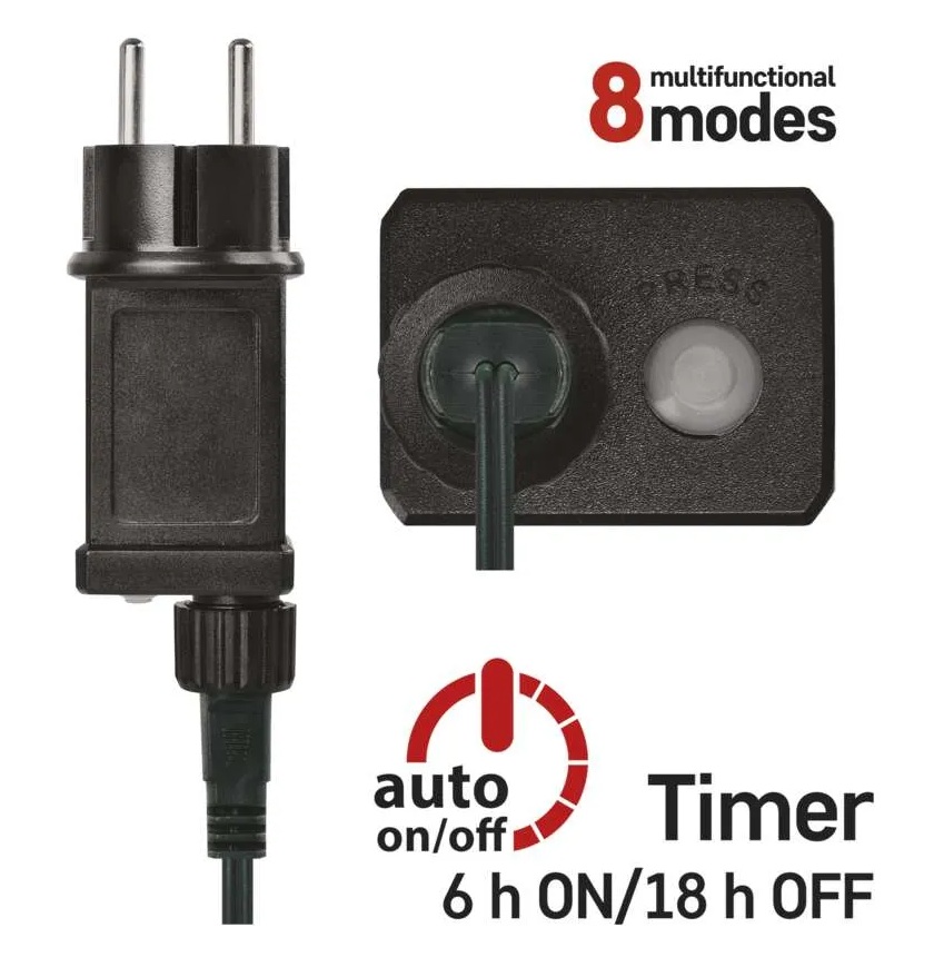 The 50 m long light chain with 500 bright LEDs in cold white will beautifully highlight the tree and house decoration. Thanks to the IP44 protection, it is suitable for outdoor and indoor use. It offers 8 light modes (multifunction) and a practical timer for convenient automatic lighting. The green cable blends in with the branches and the 5 m power cord makes it easy to connect to the socket.