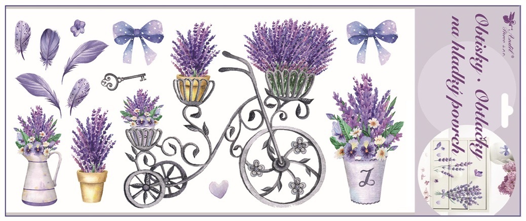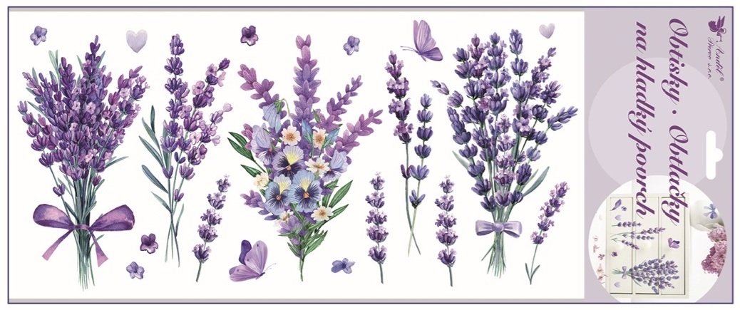 Lavender transfers are a decorative accessory suitable for quickly and easily transforming interiors. The delicate lavender floral motifs bring a natural and calming look to the space, enhancing a child's room, bedroom, living area, or other living spaces. This transfer is applied by simply **pressing on the back of the design**, transferring the motif onto a smooth surface.