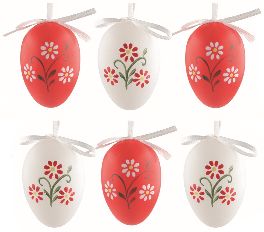 Easter plastic Eggs, Flowers red and white 6 cm, for hanging, 6 pcs in a bag