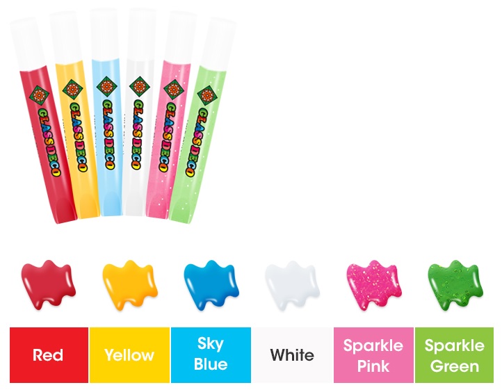- 4 bottles of glass paint (10.5 ml): red, yellow, light blue, white