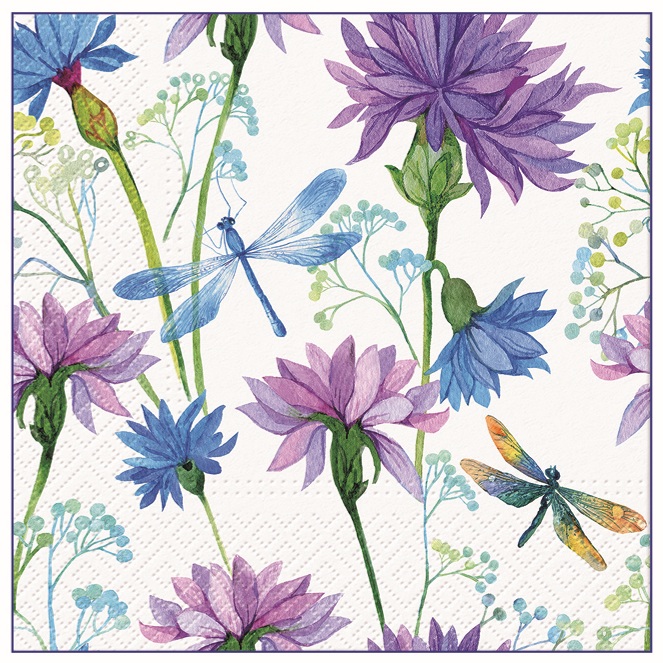 Practical all-year paper napkins with a delicate floral design and dragonflies are an elegant addition to everyday dining as well as special occasions. The natural floral motif adds a fresh and tasteful touch to the table setting. Thanks to the 3-ply construction, the napkins offer high strength, good absorbency, and comfortable use. The 33 × 33 cm size ensures versatile use when serving meals, drinks, or light refreshments.