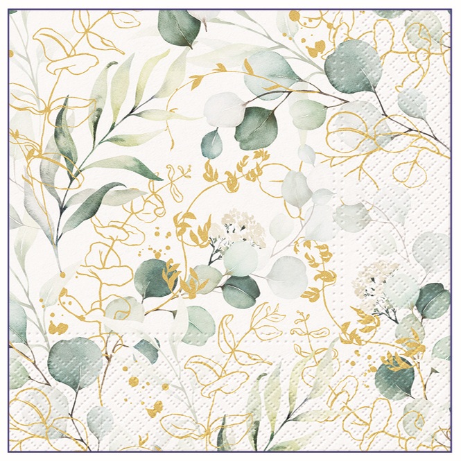 Elegant all-year paper napkins with a delicate golden and eucalyptus motif are a stylish addition to everyday and festive dining. The decoration combining golden accents with natural eucalyptus leaves creates a fresh, natural, and luxurious look, perfect for celebrations, weddings, festive tables, and family gatherings. Thanks to the 3-ply construction, the napkins offer high strength, good absorbency, and comfort in use. The 33 × 33 cm size ensures versatile use for serving meals, drinks, and light refreshments.