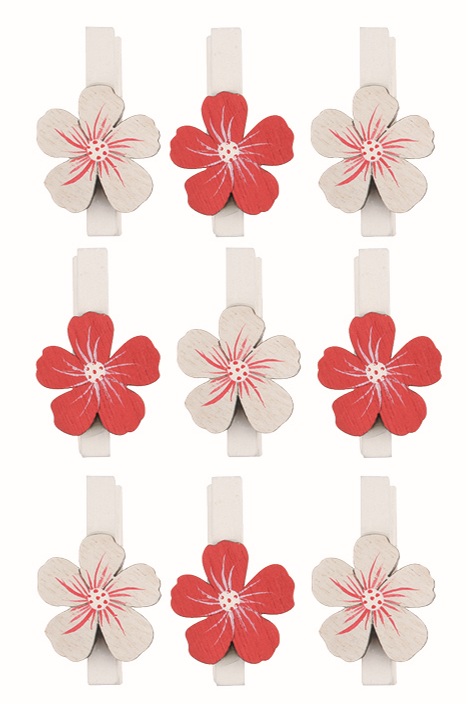 Red and White wooden Flower 2.5 x 2.5 x 0.3 cm on a peg, 9 pcs in a bag