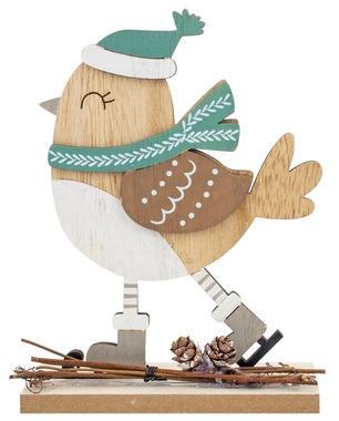 Standing Wooden Bird with Scarf and Beanie on Skates 13 x 18 cm