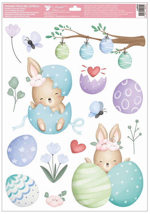 This decorative window film with a cute Easter motif of bunnies, painted eggs, and spring details, measuring 35 × 50 cm, brings a fresh and festive atmosphere to any interior. It sticks electrostatically – no glue required, leaves no residue, is easy to apply, and can be reused.