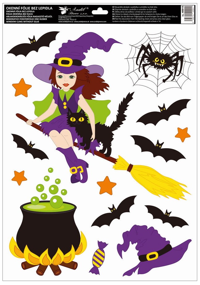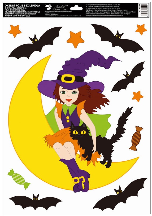 This decorative glitter window Cling with a colorful motif of witches, bats, and pumpkins brings a playful and mysterious atmosphere to your interior. Bright colors and sparkling glitters highlight the details of the design and give the film a magical effect, beautifully enhancing windows, shop displays, or glass surfaces during autumn and Halloween decorations. The film adheres electrostatically – no adhesive needed, leaves no marks, and is reusable.