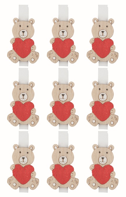 Wooden bears with a heart on a clip are ideal small decorations for creative crafts, gift wrapping, card making, or room decoration. The clip allows easy attachment to paper, fabric, or other surfaces, making them perfect for crafting with children and adults.
