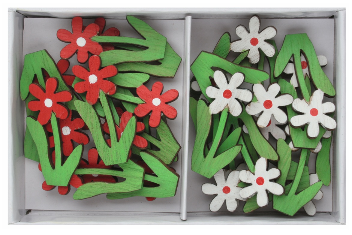 Wooden flowers white and red, 2 x 3.5 x 0.3 cm with sticker, 24 pcs in a box